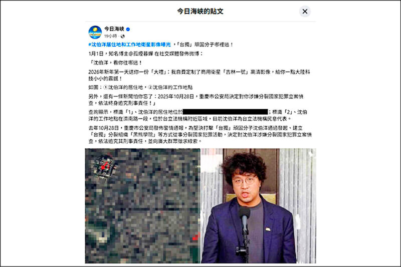 中國官媒日前在Facebook及YouTube等社群平台公開民進黨立委沈伯洋辦公及居住地點的衛星影像,並散布威脅言論。數位發展部昨表示,境外敵對勢力利用社群媒體公開威脅民主國家的國會議員,此舉已跨越紅線,數發部已於第一時間要求平台業者依社群守則儘速處理,昨日接獲Meta及Google回報,相關違規圖片、貼文及影片均已移除下架。