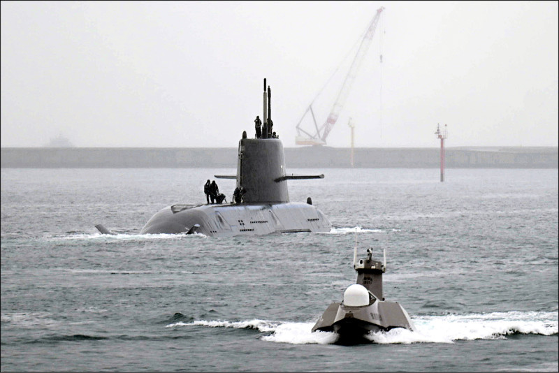 潛艦海鯤號昨天首次在高雄風強雨驟的惡劣海象中,進行第四次潛航測試,無人船奮進魔鬼魚號在一旁警戒。這也是海鯤號一月廿九日及卅日連續兩天潛航測試後,前天與昨天再度連續兩天進行潛航測試。 (圖:記者李惠洲,文:記者洪定宏)