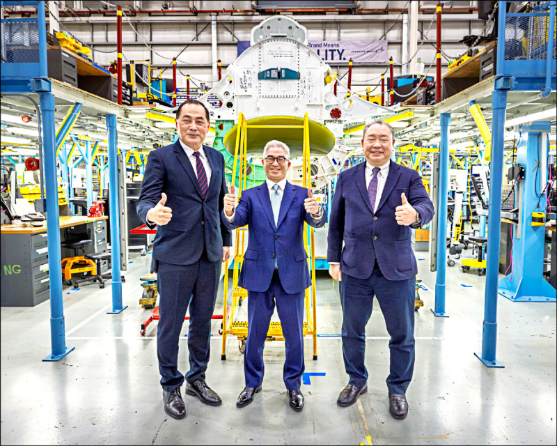 國防部副部長徐斯儉(中)、駐美代表俞大㵢(右)及空軍副參謀長田忠儀(左),一同赴生產線視察我訂購戰機的生產狀況。(國防部提供)