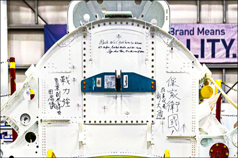 國防部昨表示,國防部軍政副部長徐斯儉於美東時間3月16日率團,在我駐美代表俞大㵢、空軍副參謀長田忠儀少將陪同下,視察南卡羅萊納州F-16 BLK70戰機生產線,見證由洛馬公司完成驗收飛行測試的首架機。我方人員還在組裝機件寫下「戰力強」、「保家衛國」以及台美「堅若磐石夥伴關係」等中英文字樣。國防部並說明,美國政府將進行最後驗收飛行,今年可啟動飛交返國作業。(圖:國防部提供,文:記者黃靖媗)