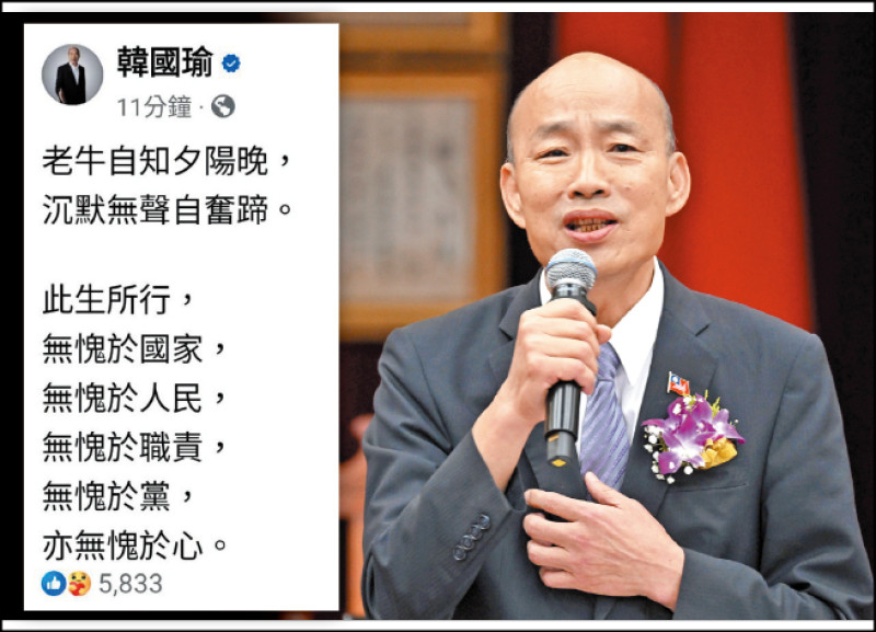張嘉郡則說,韓國瑜真的委屈了,一輩子從政為國為民、問心無愧,相信國人都看在眼裡,會繼續支持韓院長,成為他最堅強的後盾。