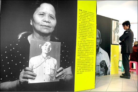 二二八見證者紀實影像展中,二二八受難者家屬羅美枝拿著父親槍決前臉上掛著微笑、從容就義的照片,讓參觀者動容。(記者余雪蘭攝)