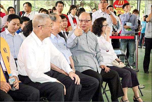 台中市長胡志強(右二)昨與行政院長吳敦義(左)出席經濟部舉辦的聯合徵才活動,吳揆在會場表示,中興新村再造案與黎明新村案並不相干。(記者唐在馨攝)