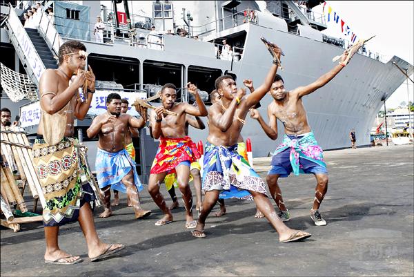 海軍敦睦支隊四月廿七日靠泊南太友邦索羅門群島荷尼阿拉港時,當地排笛舞團以傳統迎賓舞曲熱烈歡迎。(軍聞社)