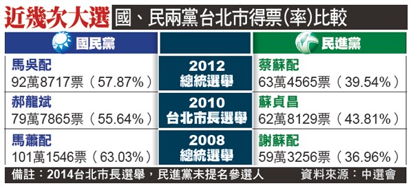 不過,檢視近幾次大選,國民黨與民進黨在台北市的得票情況,民進黨明顯居於劣勢。二○○八與二○一二年總統選舉,民進黨候選人得票率均不到四成,國民黨候選人則拿下五至六成的選票;若明年蔡英文能贏對手廿萬票,將寫下藍綠交手的新紀錄。