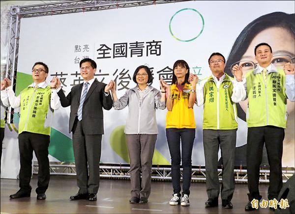 蔡英文昨晚由台中市長林佳龍、時代力量立委參選人洪慈庸陪同,出席蔡英文全國青商會後援會成立大會,現場湧入近三千位支持者。