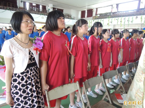 斗南鎮東明國中畢業典禮,畢業生緊拉著導師的手依依難捨。(記者廖淑玲攝)