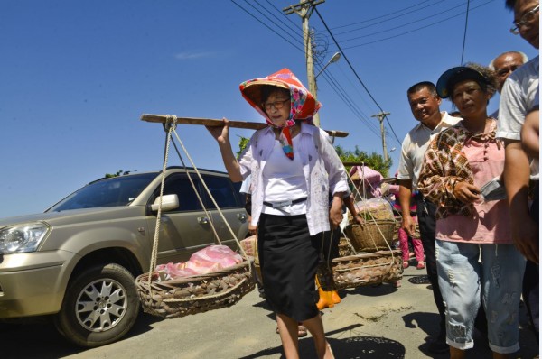 雲林縣今天上午舉行「口湖牽水狀文化祭」活動,縣長蘇治芬帶頭挑扁擔祭亡靈。(記者鄭旭凱攝)