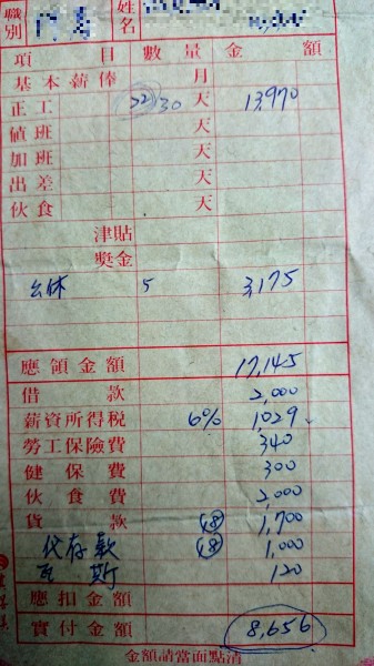 什麼都漲,唯獨薪水不漲,老闆還偷調打卡鐘騙人加班?新北市2名外勞向警方指控,王姓雇主平時除藉故扣薪外,還偷偷將打卡鐘時間往前撥來拐騙加班,2人薪資袋上寫著應領1萬7000多元,扣東扣西後卻只剩下8千多元,有時甚至窮到得去三重橋下捕魚充飢!