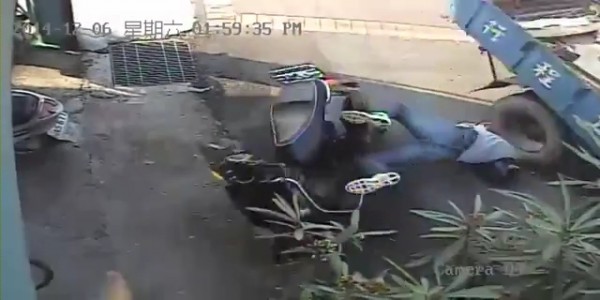 這支影片一開始就是1位騎士連人帶車被貨車撞飛,騎士落地後頭部正好落在貨車右後輪前方,瞬間遭輪胎狠狠撞上,但因為騎士戴的是安全性較高的安全帽,所以只是被撞開一段距離,幸運保住一條生命。