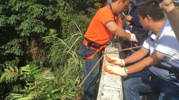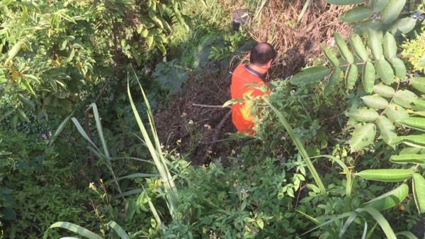 檢警在龜山區萬壽路邊坡下方約3公尺處,尋獲卡在樹叢、垃圾堆中的觀音像。(記者鄭淑婷翻攝)