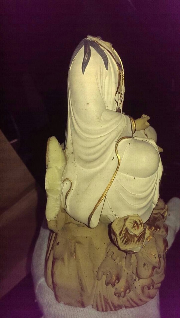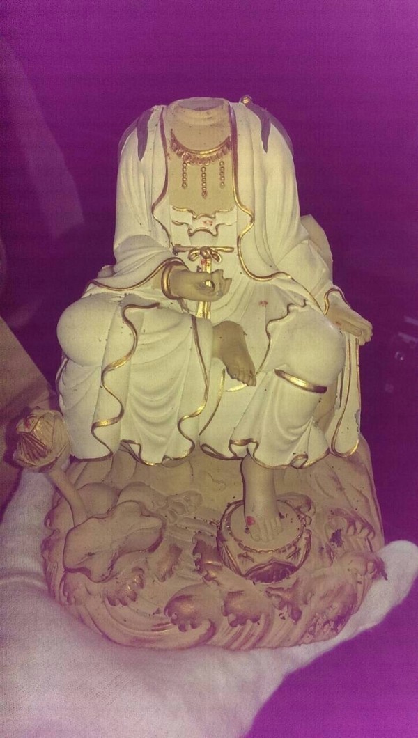 尋獲的觀音像,身上沾有血跡,神像頭部被砸到斷頭。(記者鄭淑婷翻攝)