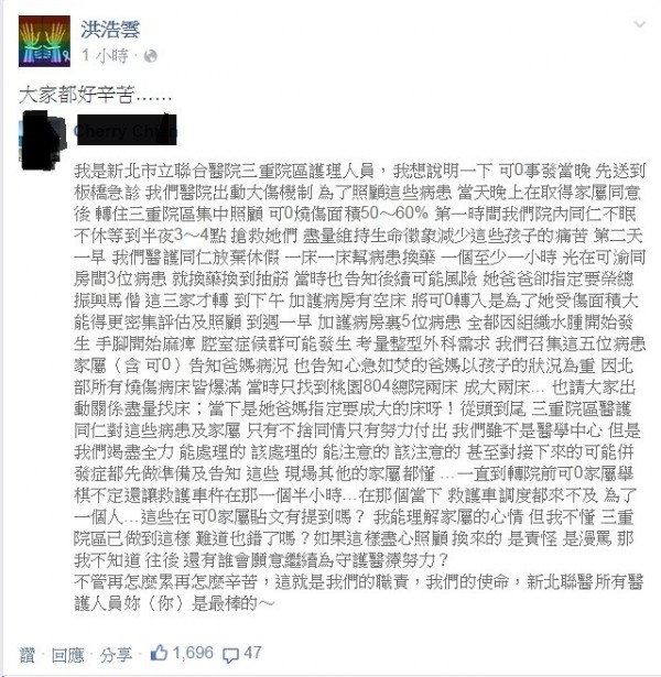 洪浩雲在臉書嗆聲「你有種公開我就應戰,有種指責我們醫院就來看看到底誰對誰錯」,並轉貼聯醫三重分院的一名護理人員的臉書,內容指出,醫護同仁紛紛放棄休假,光是幫一個病患換藥就要花費3小時,「換藥換到抽筋」,也講述整個事發過程,這名護理人員最後表示:「不管再怎麼累再怎麼辛苦,這就是我們的職責,我們的使命。」