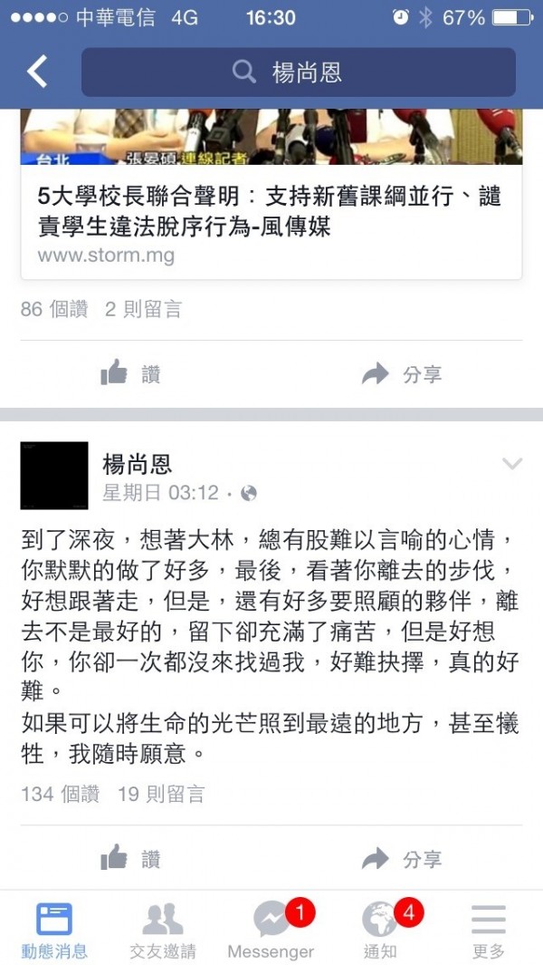 陳耀南表示,4日凌晨2點接獲警政署通報,發現楊尚恩臉書狀態寫著「好想用死亡倒數壓迫政府」、「還沒頭七,不要急」、「如果可以將生命的光芒照到最遠的地方,甚至犧牲,我隨時願意」等負面、灰色訊息,擔憂他精神狀況不佳,恐有性命安全,因此於上午7點50分派員至楊母家中關切。
