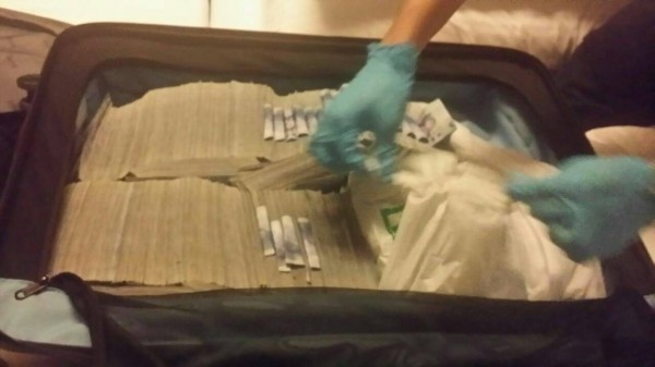 警方在酒店房間內的行李箱中找到4千多萬元贓款,部分鈔票只是用千元鈔稍微包起就放進行李箱。(記者王冠仁翻攝)