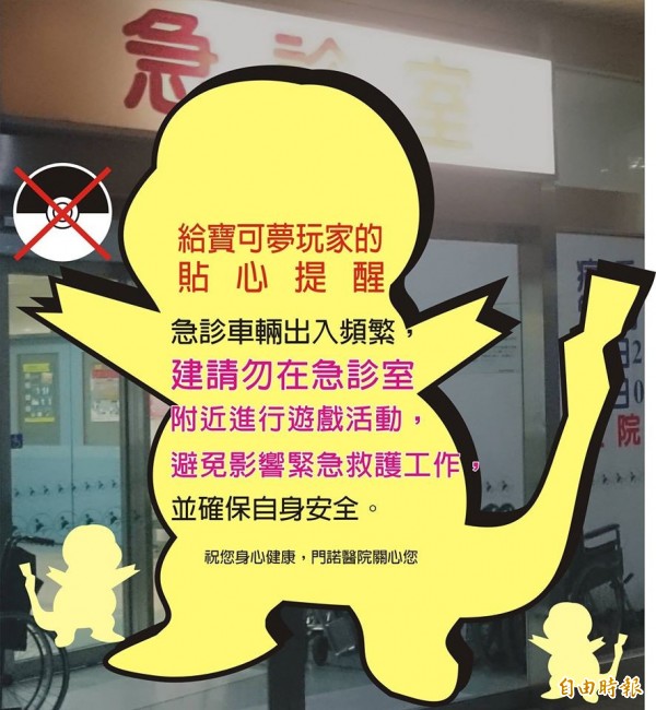 門諾醫院今天為此還在急診室門口樹立大型看板「給寶可夢玩家的貼心提醒:急診車輛出入頻繁,請勿在急診室附近進行遊戲活動,避免影響緊急救護工作,確保自身安全」。公共事務總監周恬宏呼籲「希望玩家不要在醫院門口『撒花』」,造成人潮聚集。
