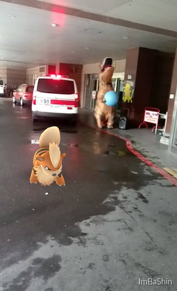 門諾急診室門口現場測試,真的有一隻寶可夢「卡蒂狗」就站在急診門口,旁邊就是救護車。(記者花孟璟翻攝)(記者花孟璟攝)
