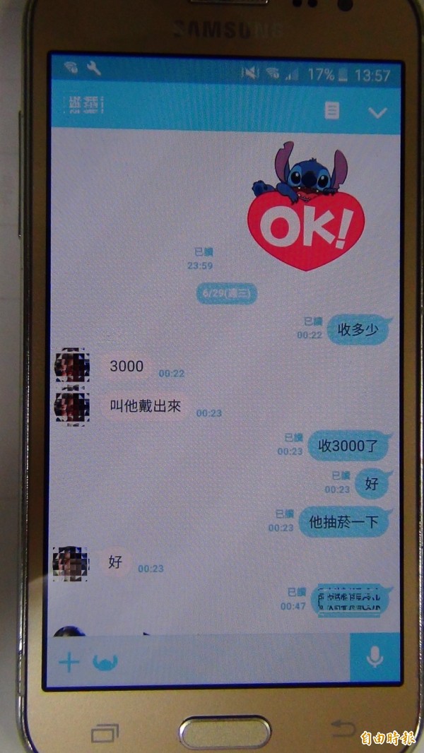 警方今天指出,該未成年少女的手機內有多筆疑似性交易訊息,如「收3000了」、「他抽菸一下」、「在XX屋(汽車旅館)」等,經溝通才突破女孩心防,坦承因缺錢而從事賣淫。