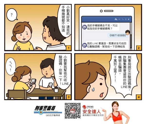 刑事局呼籲,LINE公司經由簡訊所傳送的四位數認證碼為自身帳號密碼,如同任何帳號密碼一樣重要,不應幫人代收且不可告知任何人,另若接到親友傳LINE借錢或要求代購遊戲點數,務必直接致電本人查證,有問題可撥打反詐騙諮詢專線165查詢。