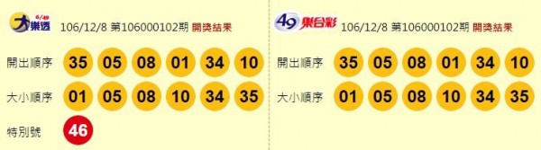 第106000102期大樂透中獎號碼為:「01、05、08、10、34、35,特別號:46。」頭獎、貳獎均摃龜;參獎共34注獲得,每注可得5萬6038元;肆獎共99注獲得,每注可得1萬2372元;伍獎共2296注獲得,每注可得2000元;陸獎共2440注獲得,每注可得1000元;柒獎共2萬4656注獲得,每注可得400元;普獎共4萬1497注獲得,每注可得400元。