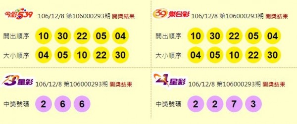 第106000293期今彩539中獎號碼為「04、05、10、22、30」,頭獎共1注獲得,可獨得800萬元;貳獎共238注獲得,每注可得2萬元;參獎共7555注獲得,每注可得300元;肆獎共7萬5547注獲得,每注可獲得50元。