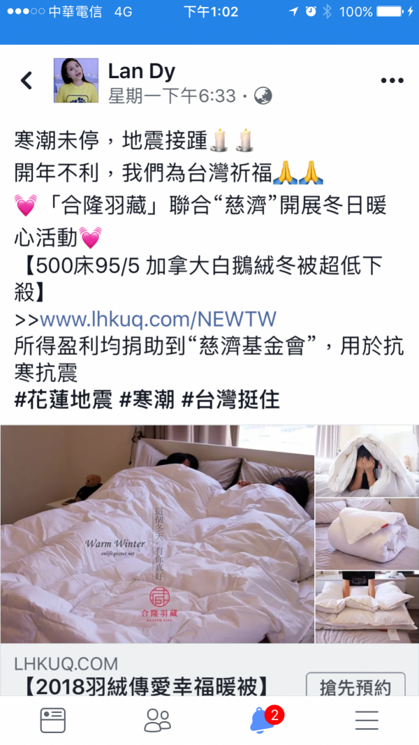 由於這2個詐騙專頁,不僅打著「合隆羽藏」的名號、擷取以往新聞災害畫面,廣告文指出,慈善義賣羽絨被支援民眾「1折起售」、「每出售一件將捐贈一件」,甚至附上正廠「合隆羽藏」近日參與兒童之家義賣被子的愛心活動相呼應,讓熱情民眾果然未查清就冒然下訂,遭冒名的業者本週二(6日)下午立刻在官方臉書po出「防詐騙公告」,提醒民眾到官網或展示門市購買,至於下訂民眾,在不肖業者「貨到付款」時,拒付款拒收貨即可。