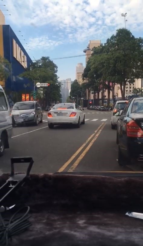 有民眾在台中市南屯區惠文路與向上路二段路口,驚見1部在對向車道停等紅燈的白色賓士。(圖擷取自爆料公社)