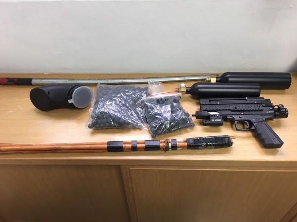 警方起獲瓦斯衝鋒槍、鐵棍、木劍、藤條等物品。(翻攝資料照)