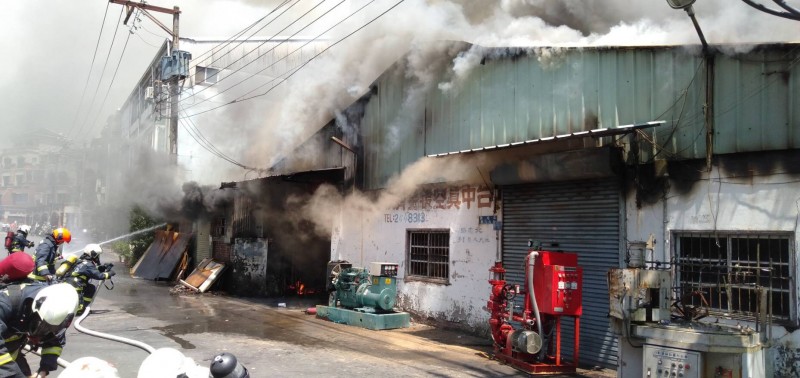 台中市北屯區一家已停業的電鍍工廠失火,消防人員到場灌救。(台中市消消防局提供)