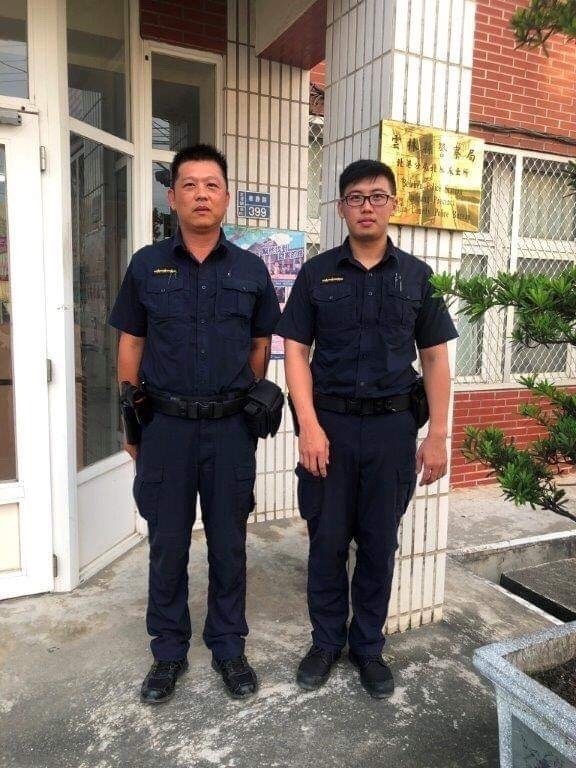 北港警分局北辰派所警員施宗仁(右)、吳孟豪(左)協助導航卡農田的駕駛脫困。(記者廖淑玲翻攝)