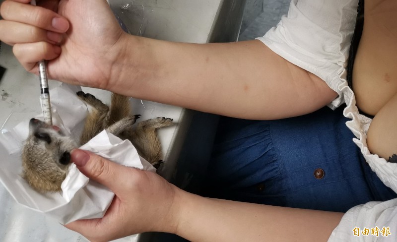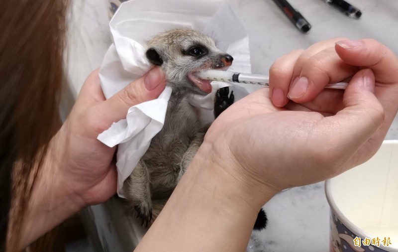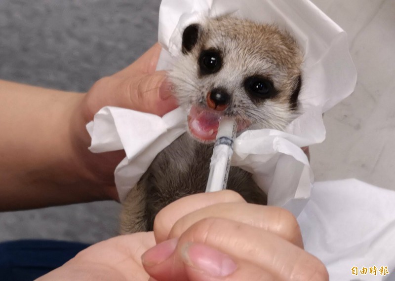桃園機場首度查獲旅客非法夾帶走私非洲狐獴,查獲的2隻罕見狐獴,由於不到2個月大,旅客還心疼牠們,當場餵食牛奶,狐獴模樣相當可愛。(記者姚介修攝)