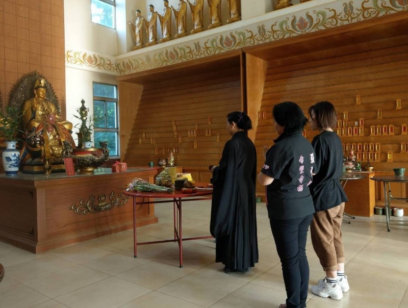 台籍女童骨灰從越南返台後,立即運至員林市納骨塔安葬,廣寧樂善團團主張雪如(中)等人在旁禱念。(記者陳冠備翻攝)