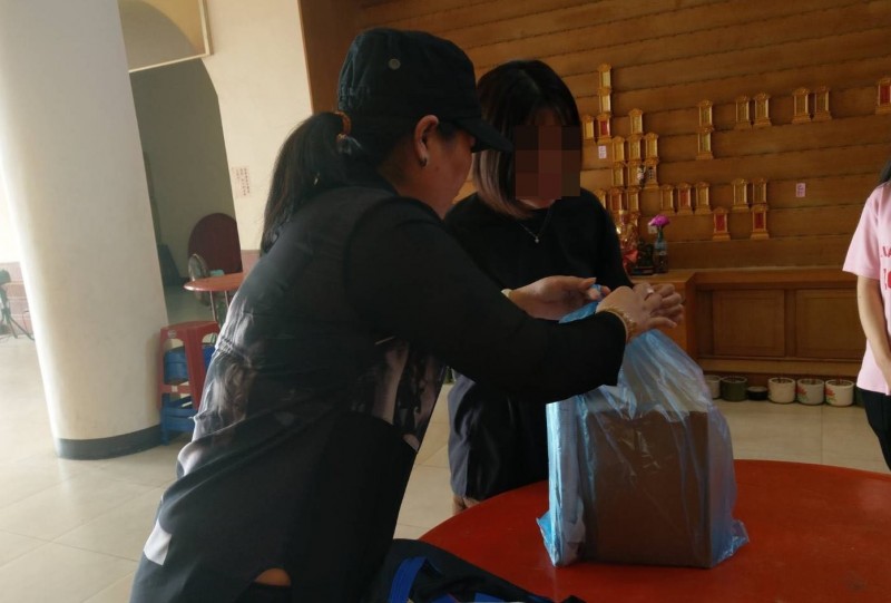 台籍女童運回台灣後,阮氏(戴帽者)小心翼翼拆開放置女兒骨灰罈的包裝袋。(記者陳冠備翻攝)