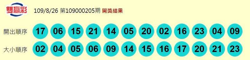 第109000205期雙贏彩中獎號碼為「02、04、05、06、09、14、15、16、17、20、21、23」,頭獎摃龜;貳獎共6注中獎,每注可得10萬元;參獎共185注中獎,每注可得500元;肆獎共2050注中獎,每注可得100元。
