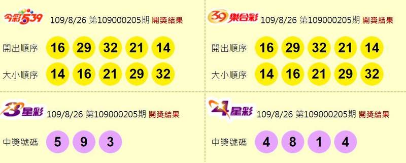 今晚(8月26日)開獎的第109000205期今彩539,頭獎開出3注,每注可得獎金800萬元,由台中市北屯區水湳里中清路二段116號1樓的「宜益彩券行」、桃園市桃園區龍鳳里龍安街88號的「億金彩券行」以及台北市信義區松山路529號的「金順發行」開出;第109000205期雙贏彩,頭獎摃龜。
