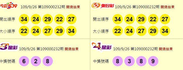 第109000232期39樂合彩中獎號碼為「22、24、27、29、34」,四合開出24注,每注可得21萬2500元;三合共677注中獎,每注可得1萬1250元;二合共1萬1514注中獎,每注可得1125元。