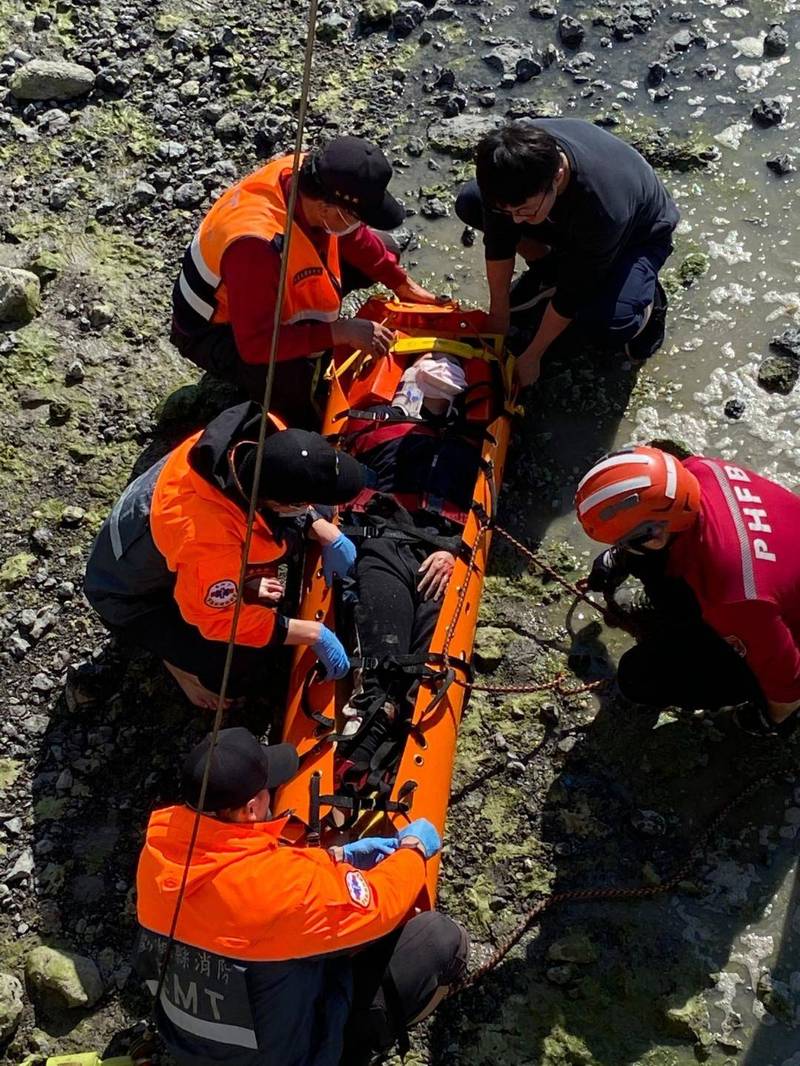 消防局派出吊車,將受傷人員及擔架吊起。(澎湖縣政府消防局提供)
