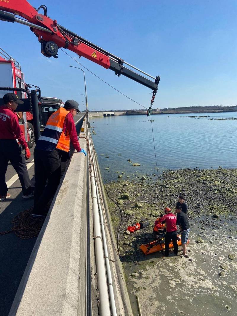 中正橋發生騎士與乘客自撞橋墩墜橋意外,消防局派員趕往搶救。(澎湖縣政府消防局提供)