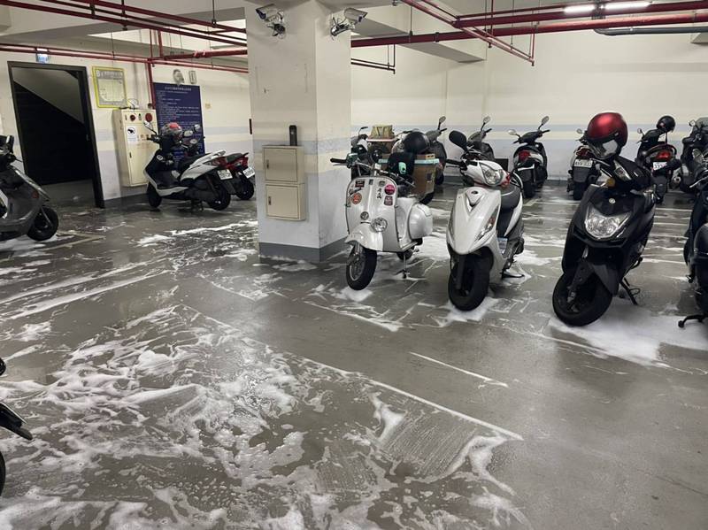 泡沫蓋滿整個停車場,不少機車受到波及。(記者鄭景議翻攝)