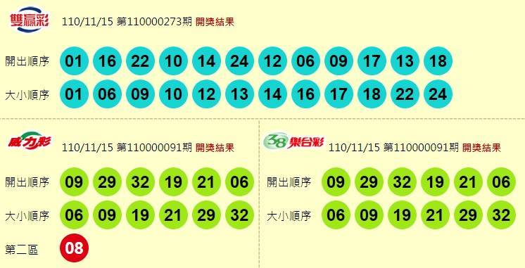 雙贏彩、威力彩、38樂合彩開獎獎號。(擷取自台灣彩券官網)