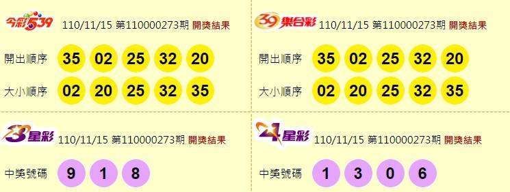 第110000273期39樂合彩中獎號碼為「02、20、25、32、35」,四合共9注中獎,每注可得21萬2500元;三合共315注中獎,每注可得1萬1250元;二合共8874注中獎,每注可得1125元。