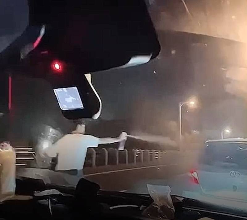 網路瘋傳行車糾紛嗆聲反被噴霧影片,警方介入調查才發現原來是「演的」。(周球哥提供)