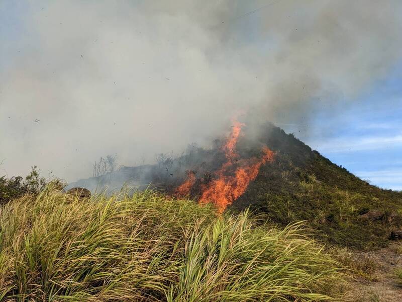 山頭起火燃燒,火勢猛烈,濃煙直竄天際。(記者吳昇儒翻攝)
