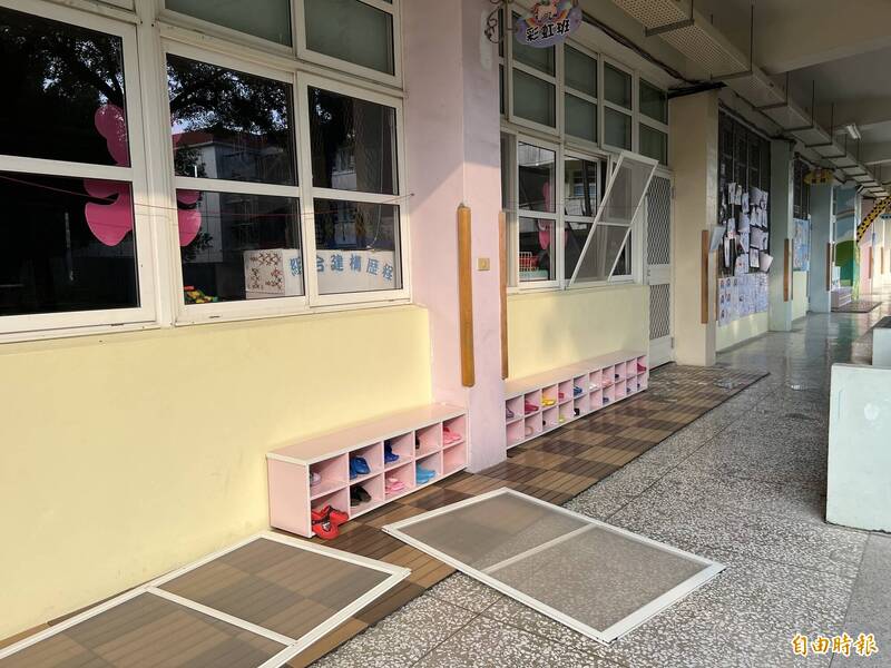 前進國小教室紗窗震落。(記者羅欣貞攝)