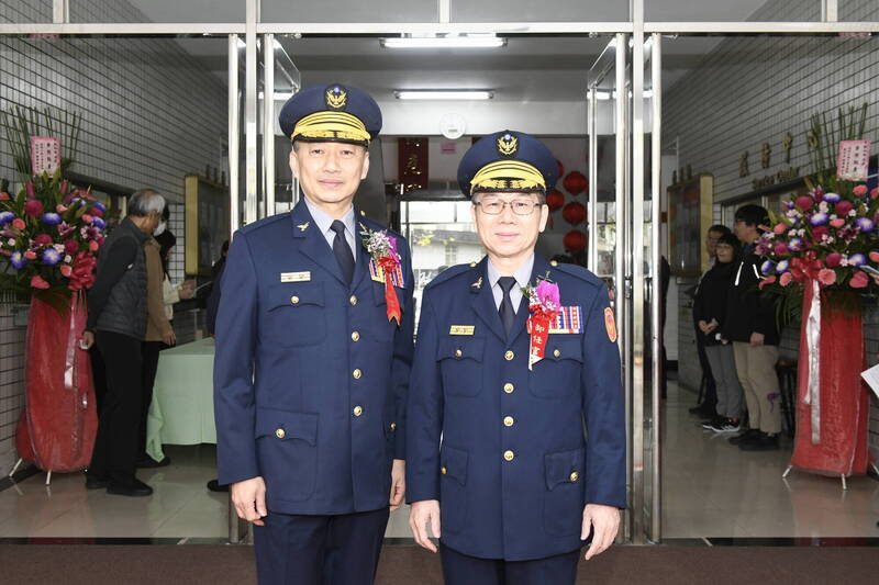 原任內政部警政署保防組長的54歲劉炯炫(左)接任宜蘭縣警察局長,原縣警察局長侯東輝調任桃園市政府警察局主任秘書,2人合影留念。(宜蘭縣警察局提供)