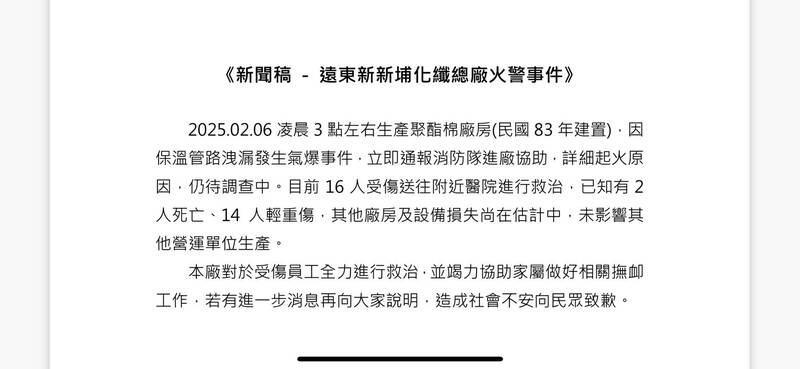 遠東新世紀化纖新埔廠今天清晨發聲明,指今天凌晨3點左右該總廠生產聚酯棉廠房因保溫管路洩漏發生氣爆事件,並非鍋爐爆炸。對已造成2死致歉。