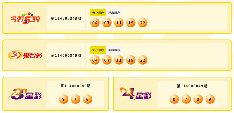 第114000049期39樂合彩中獎號碼為「04、07、11、19、22」。四合20注中獎,每注可得21萬2500元;三合共390注中獎,每注可得1萬1250元;二合共1萬3541注中獎,每注可得1125元。