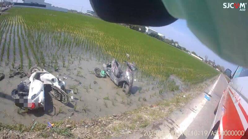嘉義縣水上鄉發生機車相撞車禍,騎士均噴飛到田裡。(記者林宜樟翻攝)
