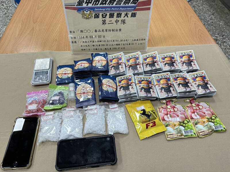 2日晚間10點,保大第二中隊在豐原區惠陽路巡邏時,發現一輛轎車違規變換車道,原本只是例行攔查,沒想到一靠近就聞到車內飄出奇怪的臭味,駕駛陳男(28歲)滿臉心虛一問三不答,最後在他同意下,警方果然在後車箱搜出甲基卡西酮145包(841公克)、他命4包(206公克)、梅錠2包(51公克)及磅秤、手機等證物。