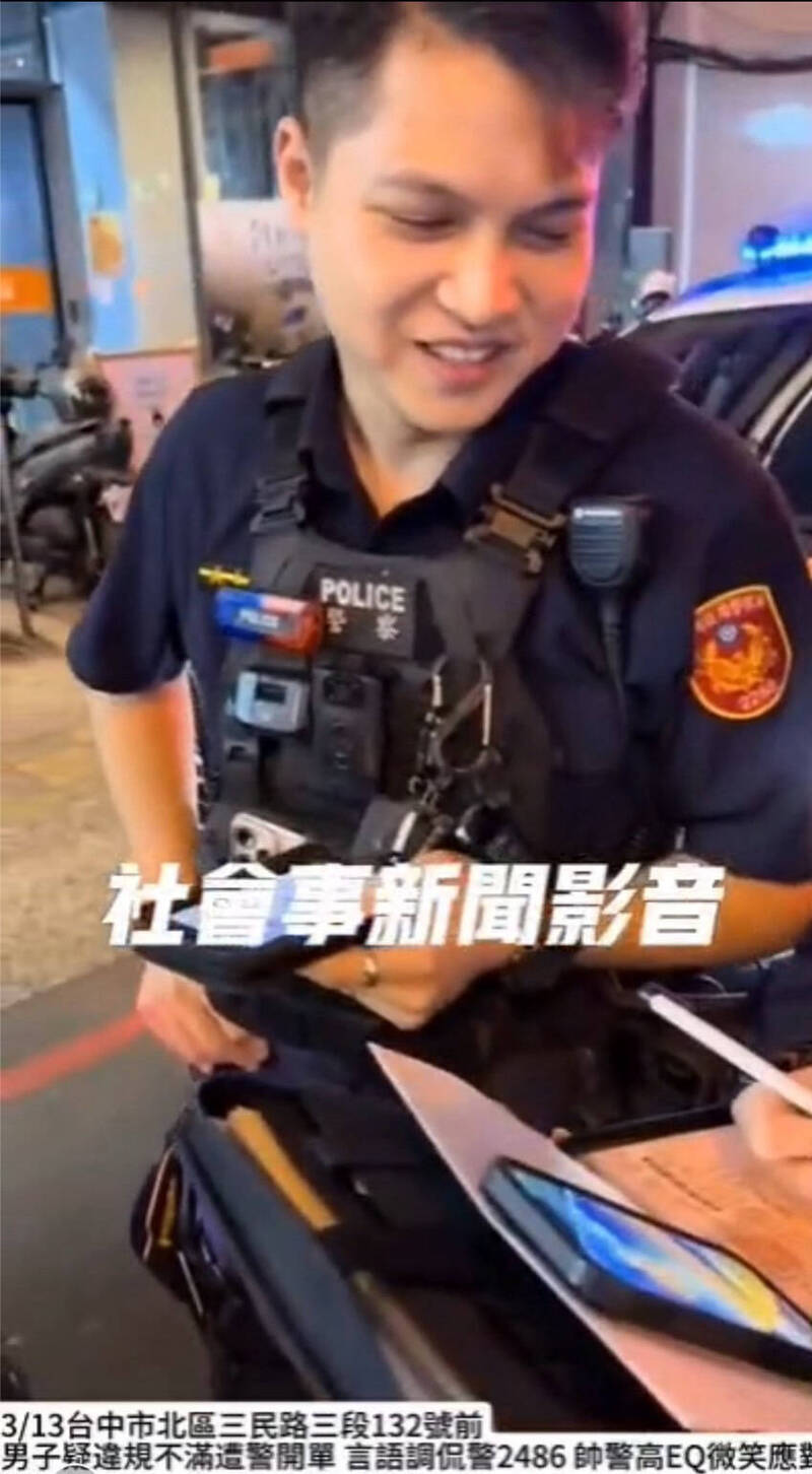 台中市一名男子近日一中商圈違停,被警方當場逮個正著,結果他不僅不認錯還爆氣咆哮,甚至故意用諧音梗調侃警員編號,脫口喊出「2486」,暗酸「兩光、白目」,但面對挑釁,警員高EQ應對絲毫不受影響,依法開出罰單,過程也被民眾拍下上傳網路社群,引發熱議。